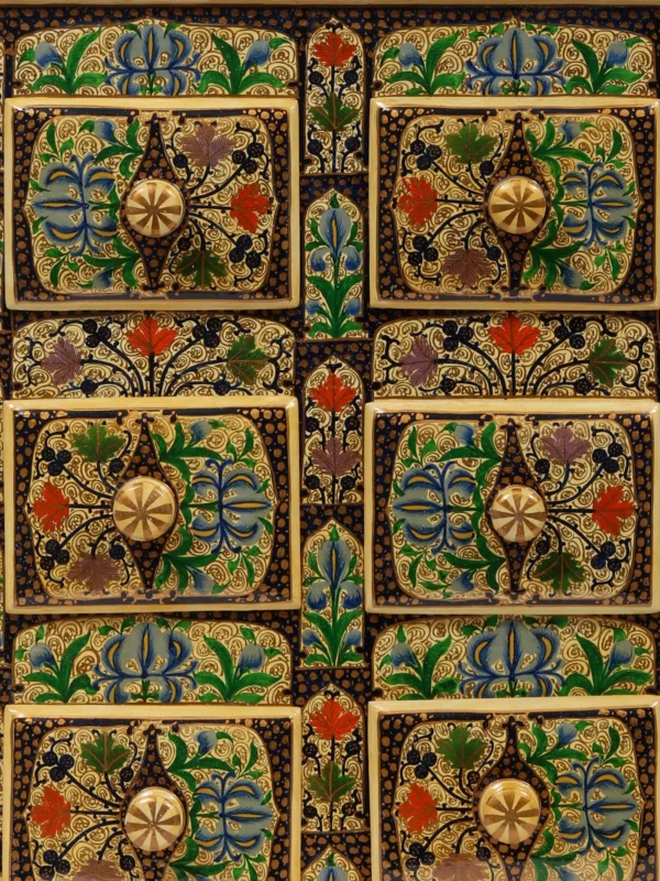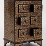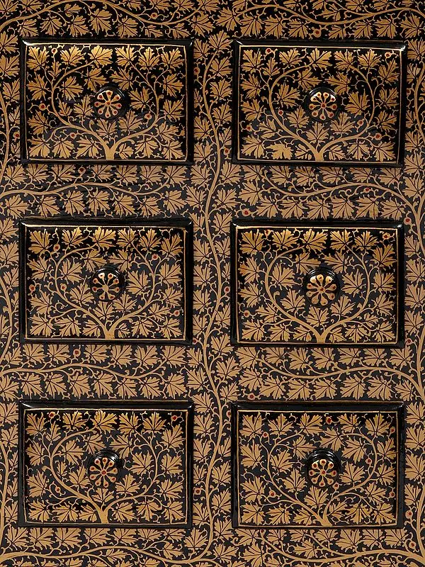 This exquisite 14-inch hand-painted chest of drawers is a testament to the rich artistic heritage of Kashmir. Crafted from a wood-based papier-mâché, this miniature chest is not just a functional piece of furniture, but a captivating work of art. Each drawer is meticulously adorned with intricate hand-painted details, showcasing the incredible skill and dedication of the artisan. The vibrant gold leaf against the deep black background creates a stunning contrast that will add a touch of elegance to any space. This piece is perfect for adding a unique touch to a home office, dressing table or shelf. It's also the perfect gift for someone who appreciates both beauty and quality craftsmanship.
