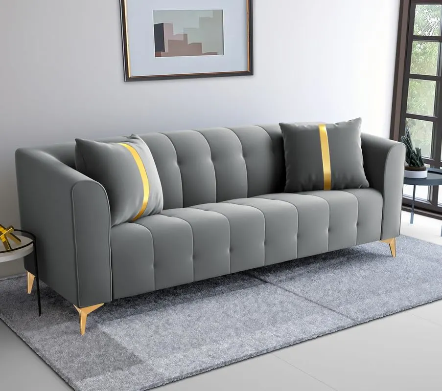 Materials = Frame - Sal Wood, Kapur Wood, Marandi Wood / Seating = 40-density HR foam / Tufted back = Soft foam & Recron fiber / Upholstery Material = Premium Velvet Suede Fabric / Style :- Modern Color = Grey / Legs = Heavy-quality chrome golden color / Seating Capacity = 3 seater / Comfort Level = Medium Firm. Zigzag Spring Suspension System = Heavy gauge zigzag springs are used under the foam to provide extra strength, comfort, and bounce.