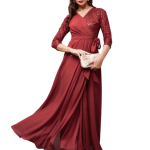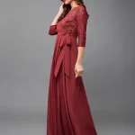 Brick Red V-Neck 3/4 Sleeve Self-Designed Wrap Styled Georgette Maxi Dress. It Has Waist Tie-up and Back Closure.